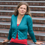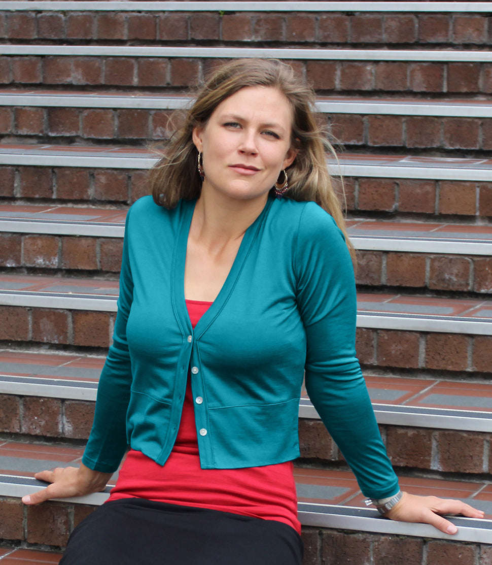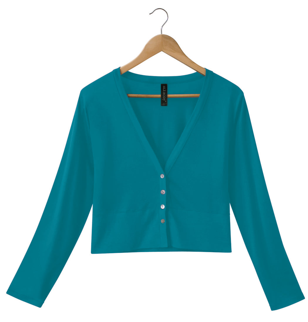 Our Silkspun V Neck Cropped Cardigan as an outer layer will see you wearing your summer dresses year round! The silk, merino and cotton blend makes the perfect lightweight cardigan that's warm without being bulky to pair with light skirts and dresses. The shorter length of this cardigan suits higher-waist skirts and dresses and also looks great layered over our 3/4 Sleeved Scoop top or Camisole.
